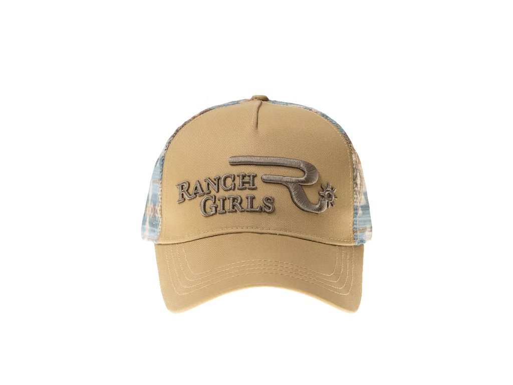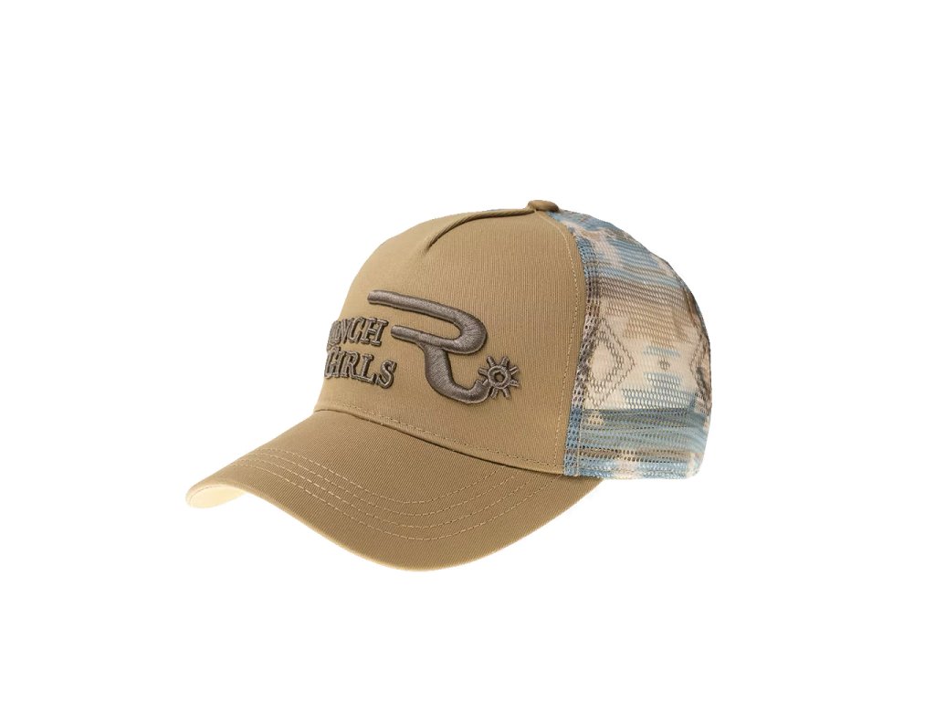 Ranch Girls Cap "AIANA", sand – dámská trucker kšiltovka v jihozápadním designu se sofistikovanou potištěnou síťovinou a ostrým vyšíváním. Díky praktickému zapínání na suchý zip je čepice snadno nastavitelná. Všestranné a pohodlné na nošení.