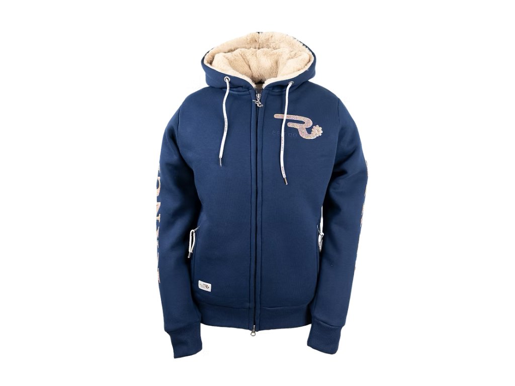 Teplá mikina z teplákoviny, podšitá měkkou umělou plyšovou kožešinou. Má rovný střih a prodloužené rukávy pro pohodlné ježdění. Na paži a hrudi je našitá flitrová výšivka. Vyrobeno udržitelným způsobem v Evropě. Materiál 65% bavlna, 35% polyester.