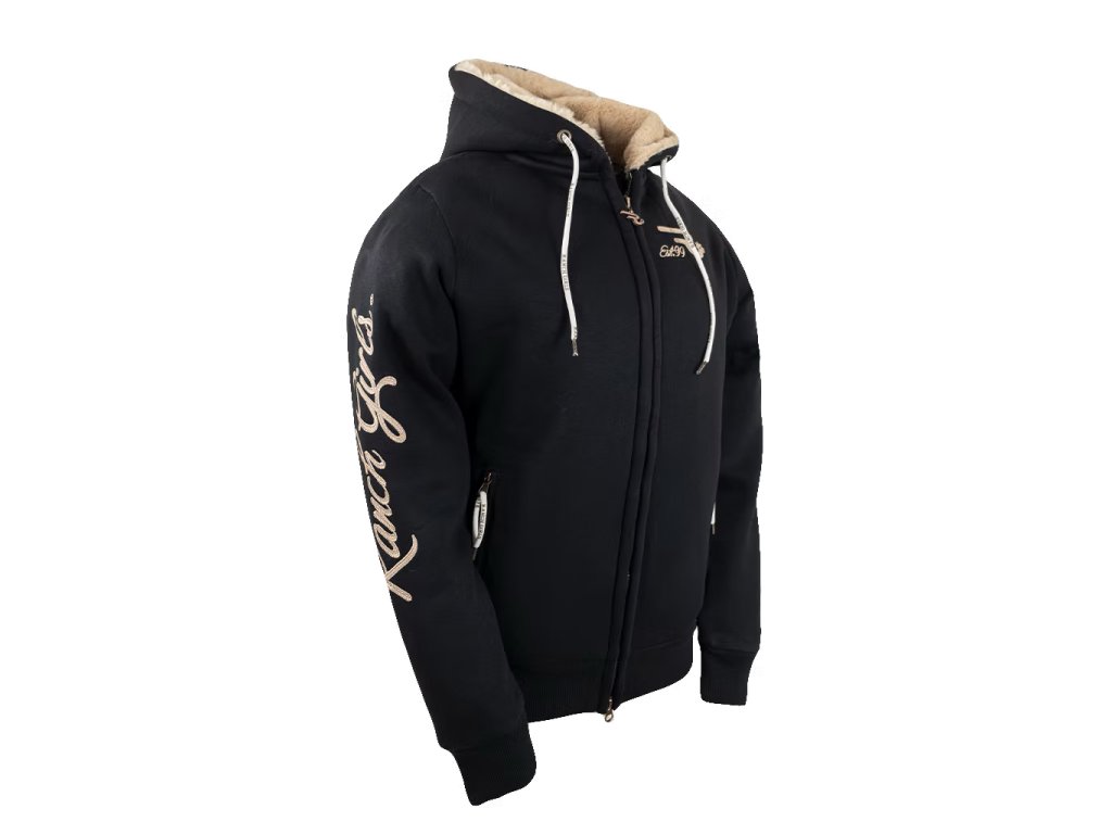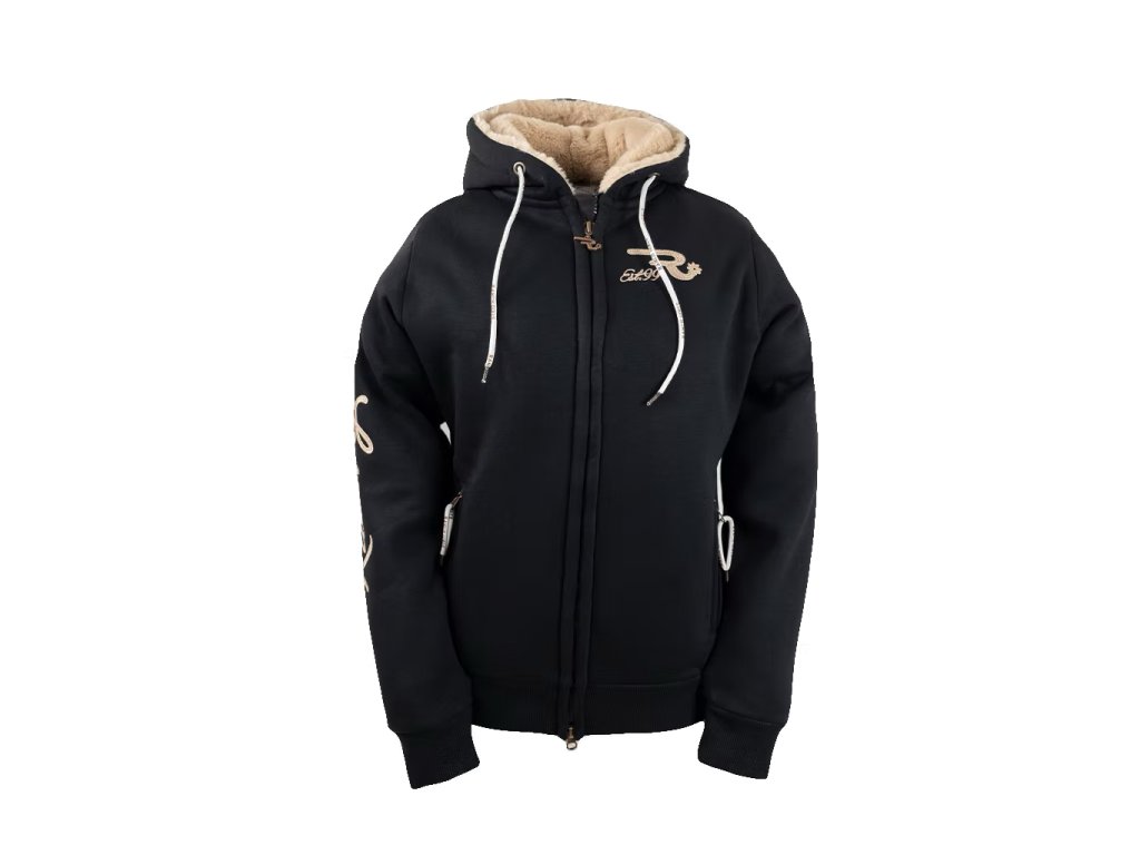 Teplá mikina z teplákoviny, podšitá měkkou umělou plyšovou kožešinou. Má rovný střih a prodloužené rukávy pro pohodlné ježdění. Na paži a hrudi je našitá flitrová výšivka. Vyrobeno udržitelným způsobem v Evropě. Materiál 65% bavlna, 35% polyester.