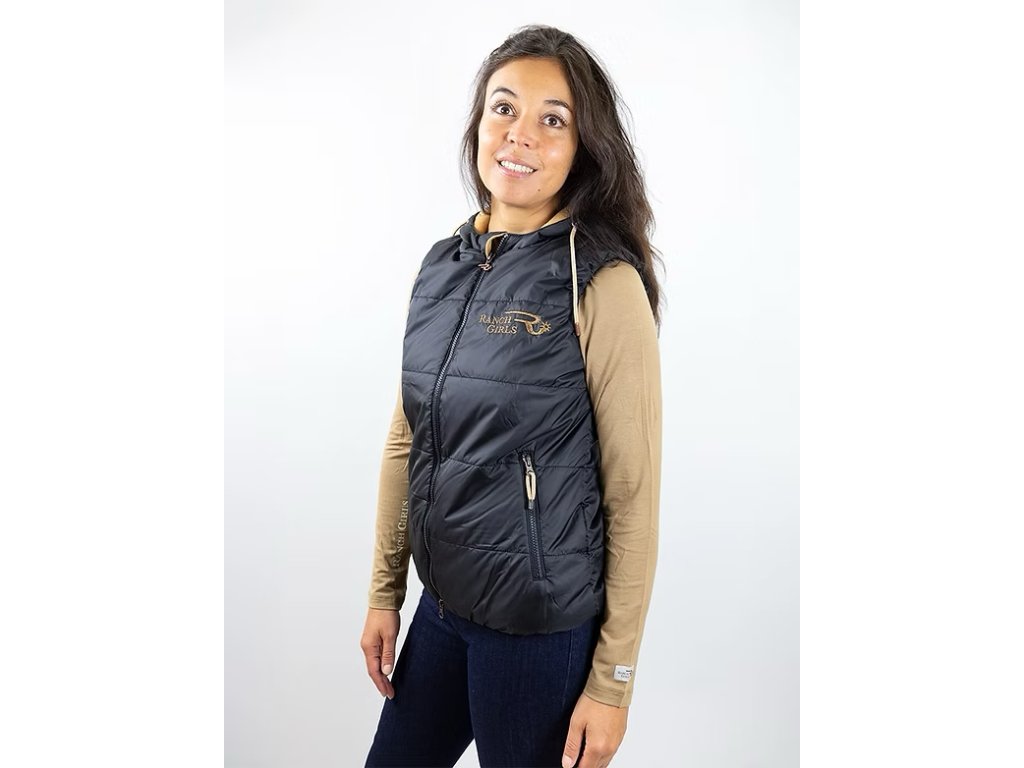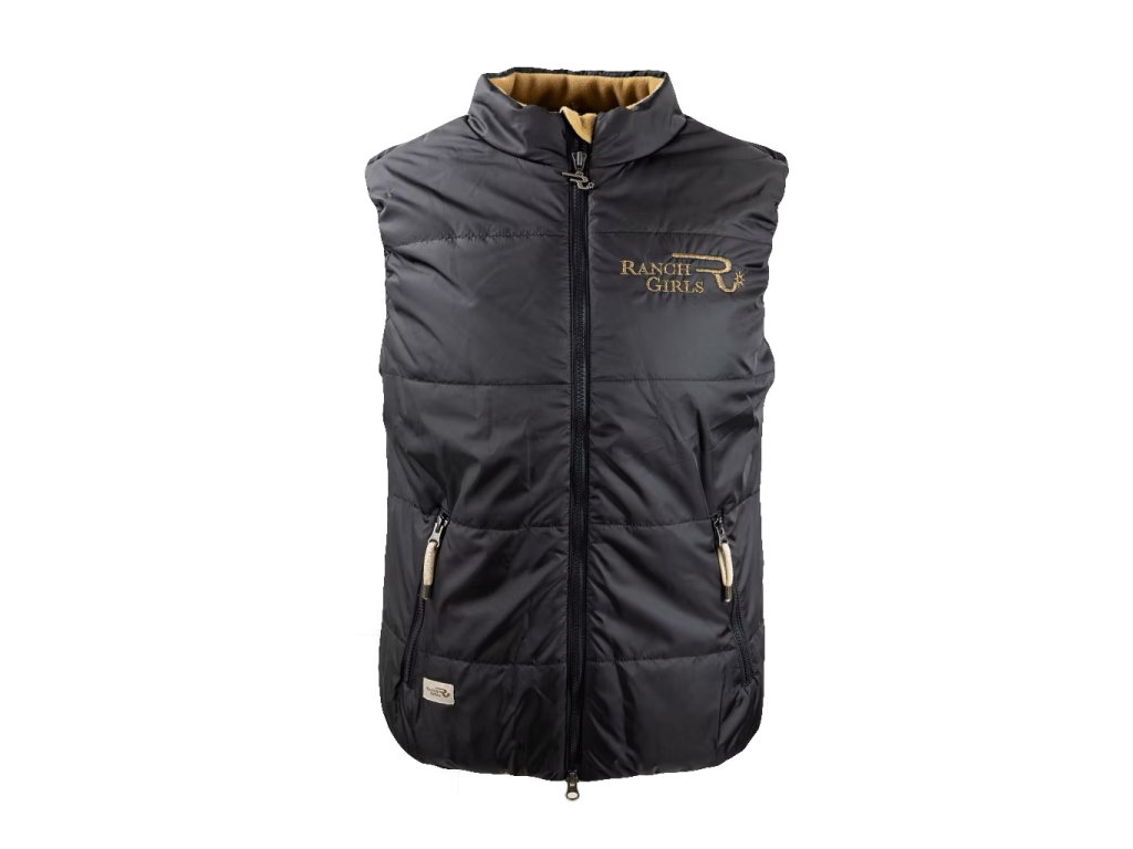Vysoce funkční vesta Ranch 'LAUREN' má přesně stejný střih jako naše oblíbená vesta 'PAM' bez kapuce. Tato westernová vesta chrání před chladem, větrem a vlhkým počasím díky podšívce z 300g polar fleecu a mikrovlákna a vysoce kvalitnímu paměťovému nylonu (nemačkavému) na vnější straně, což z ní činí jednu z našich nejoblíbenějších vest. Klasický design límce se stahovacími šňůrkami s logem. Tuto lehkou funkční vestu, která vás udrží v teple a pohodlí i v náročných povětrnostních podmínkách, si zamilujete! Dvě vnější kapsy s robustními zipy vám umožní bezpečně uložit všechny vaše nezbytnosti.