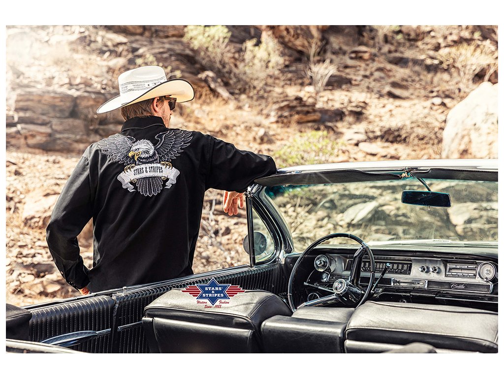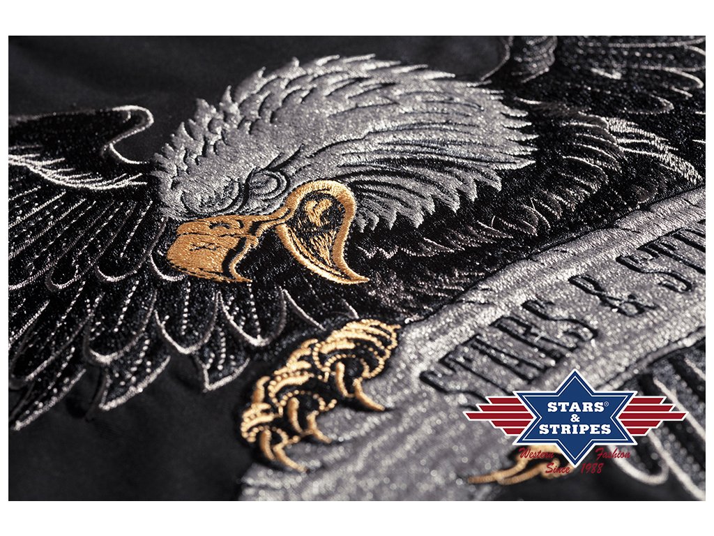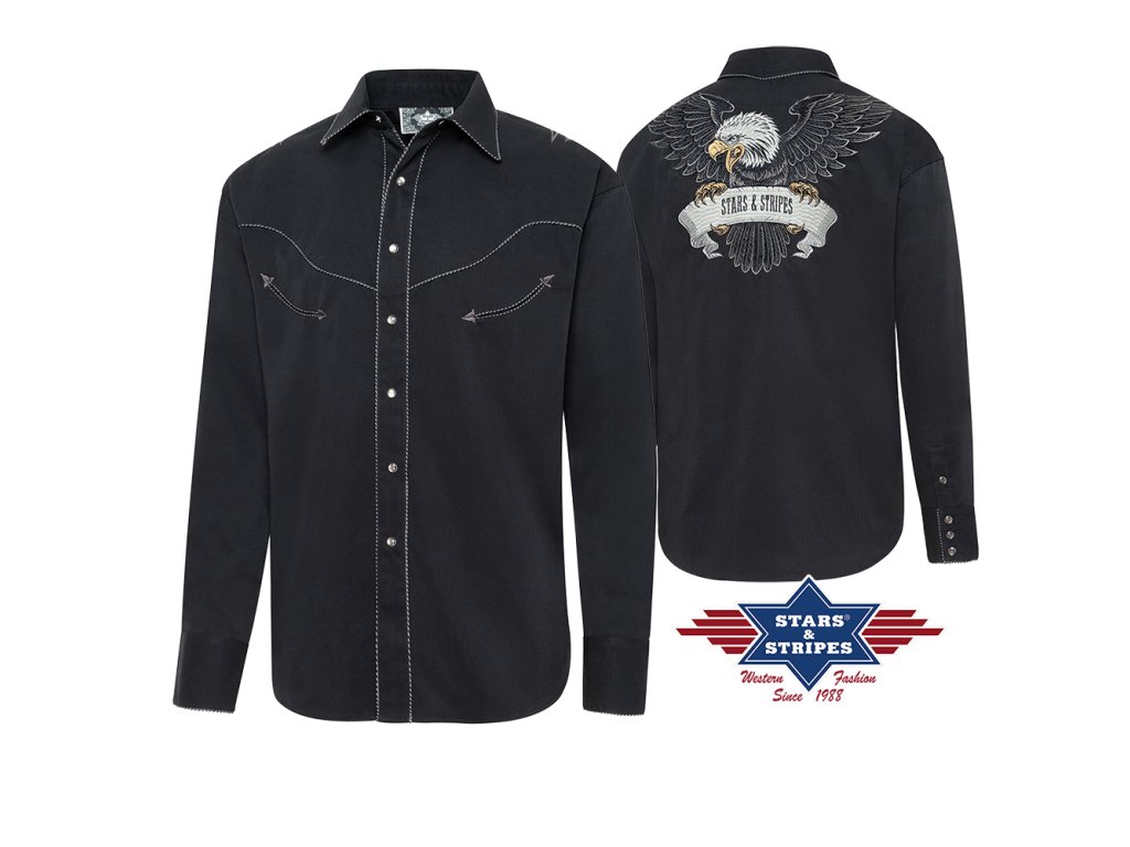 Nádherná černá westernová košile s velkým, detailně vyšívaným orlem na zádech. Harmonicky sladěné s dvoubarevným lemováním šňůrky, smajlíkovými kapsami, druky a manžetami se čtyřmi knoflíky.