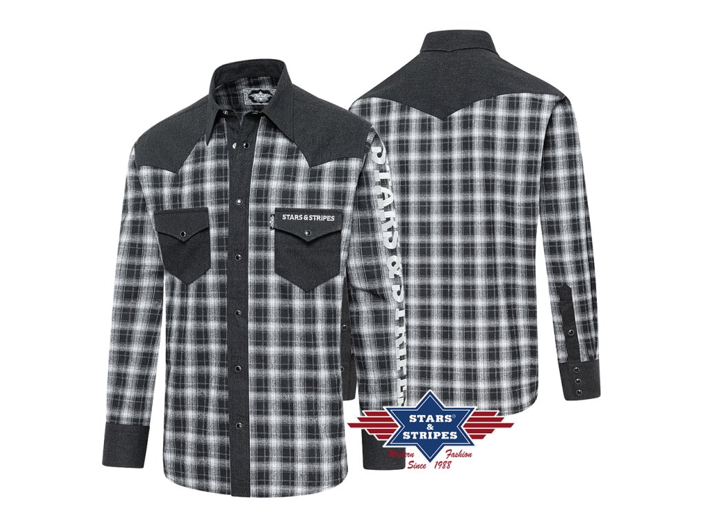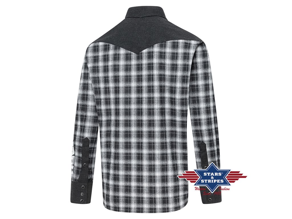 Kostkovaná westernová košile s kontrastním westernovým sedlem a nášivkovými náprsními kapsami. Slušivé cvočky a elegantně vyšívaný nápis Stars & Stripes na levé paži dělají z košile skutečný vrchol.