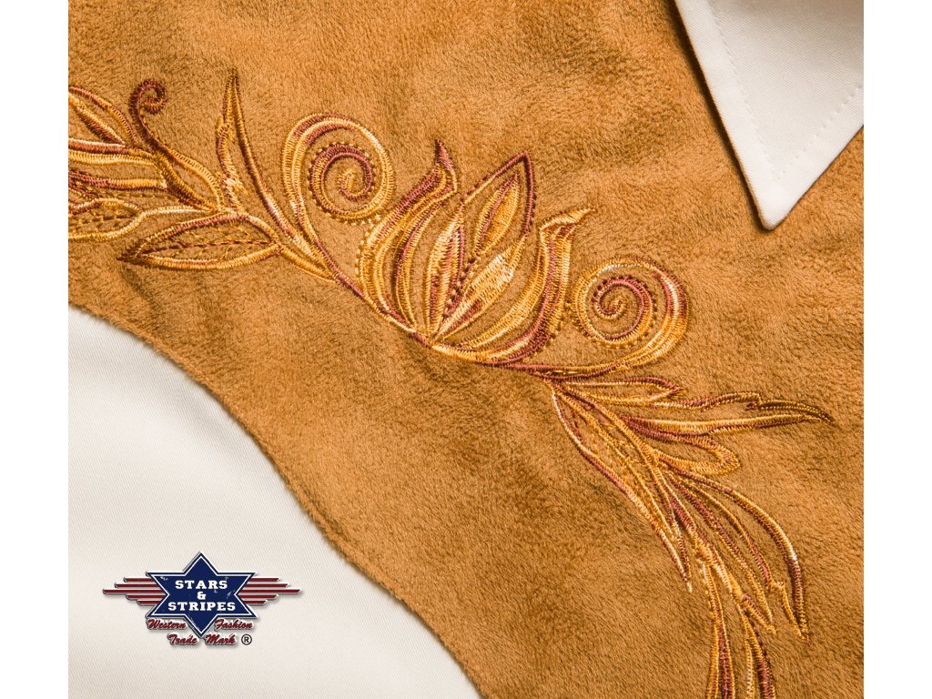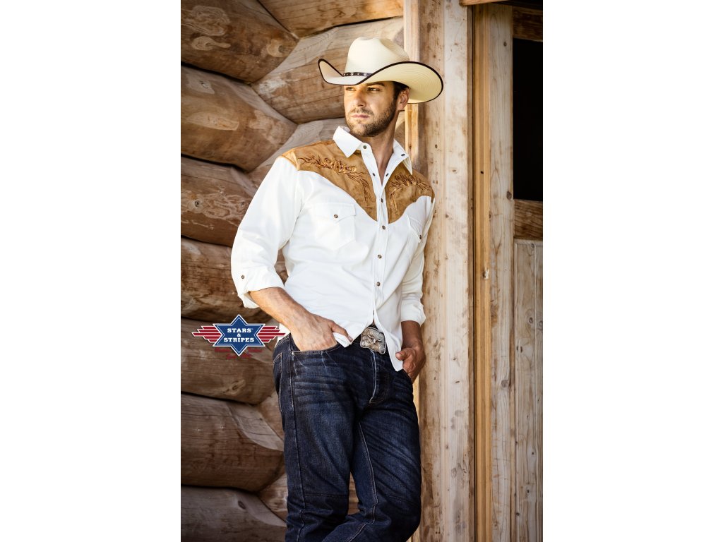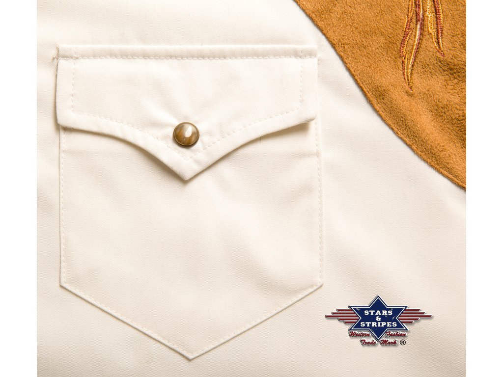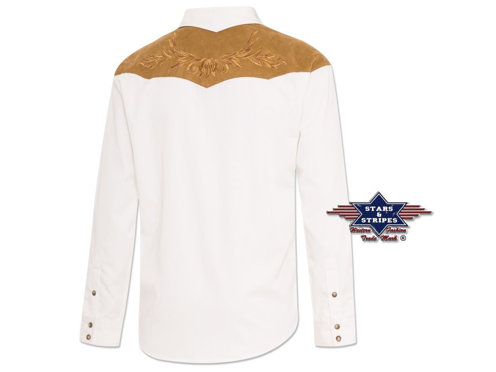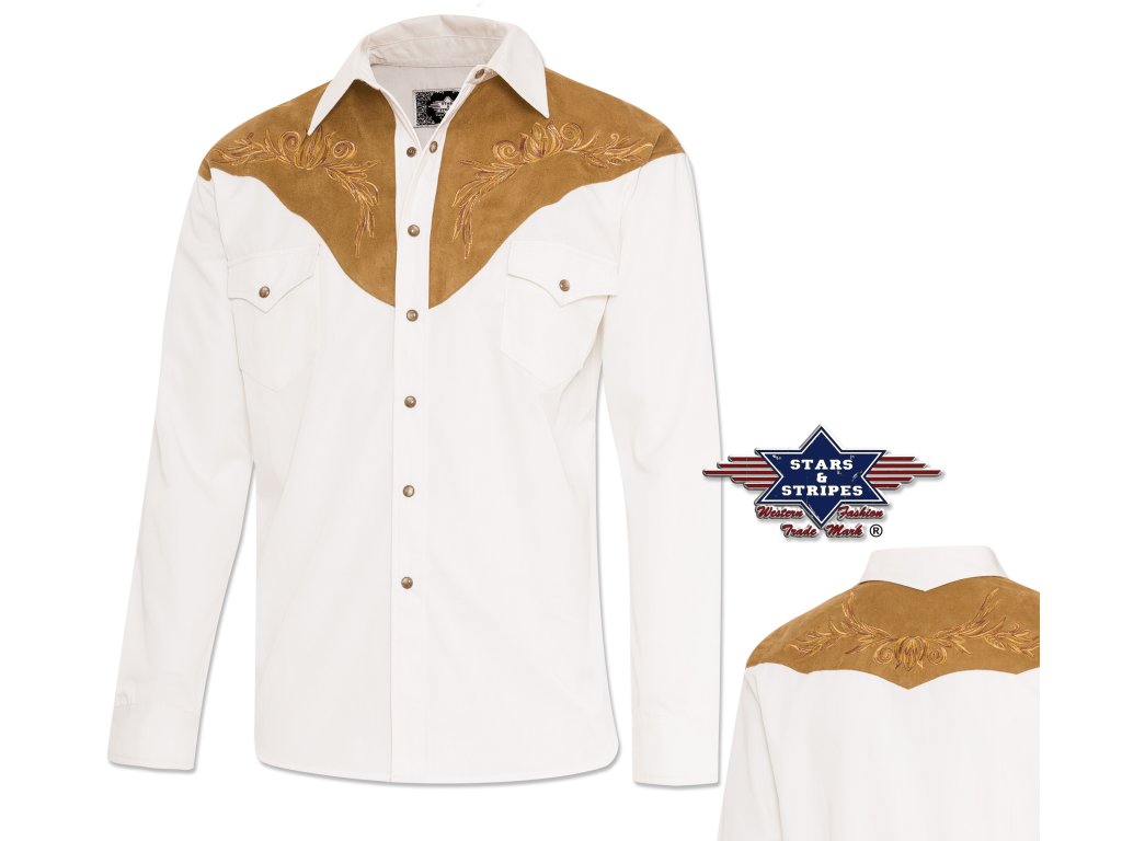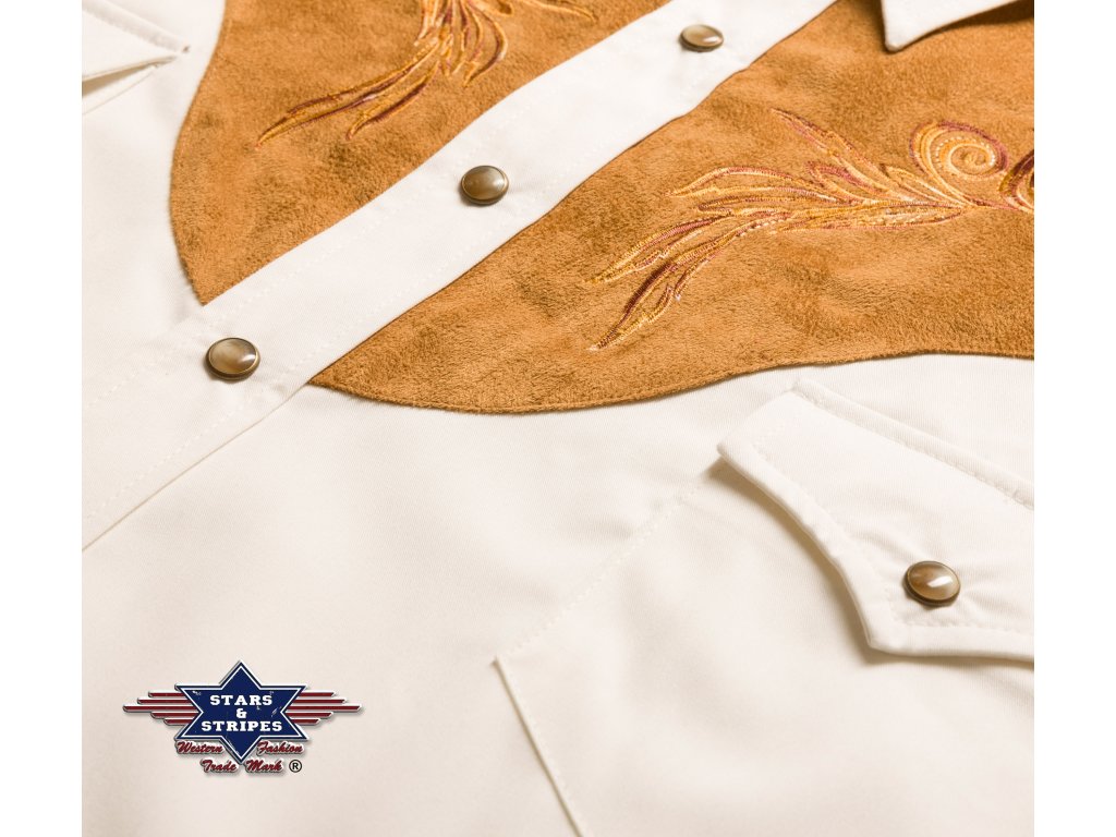 Westernová košile s lemy na ramenou v semišovém vzhledu a výšivkou. S nášivkovými náprsními kapsami a druky.