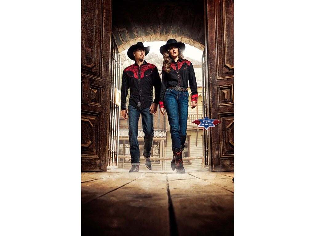 Nádherná černá westernová košile s červeným westernovým sedlem s parádní výšivkou na hrudi a zádech. Harmonicky sladěné s dvoubarevným lemováním šňůrky a manžetami se třemi knoflíky. Vhodné k dámské halence Dolly.