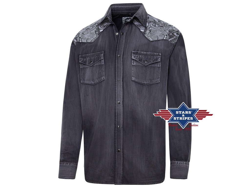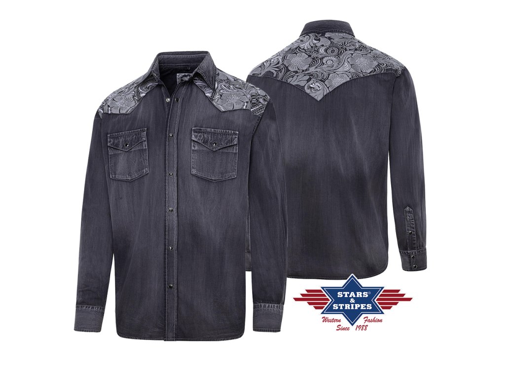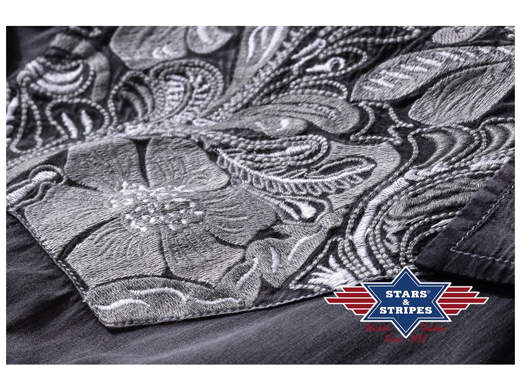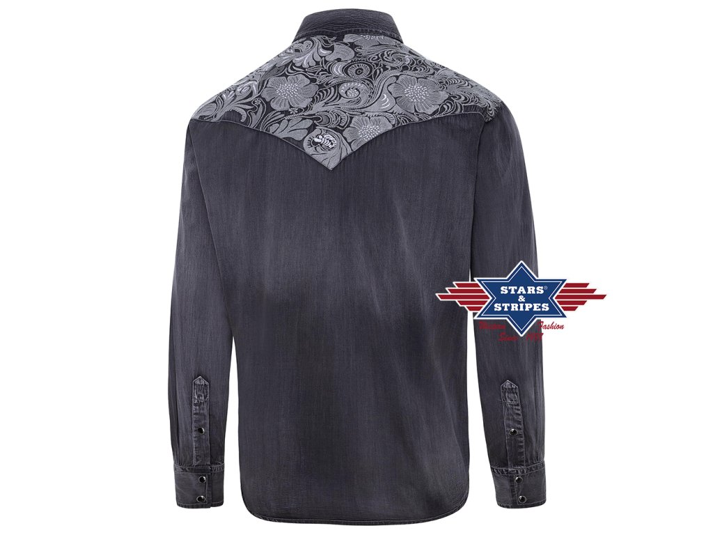 Košile je zpracovaná ve vybledlém vzhledu s náročně vyšívaným westernovým sedlem s květinovým zdobením. Díky nášivkovým náprsním kapsám, zářivým ozdobným švům a černým patentkám je košile nutností pro každého kovboje. Vhodné k westernové halence Wilma.