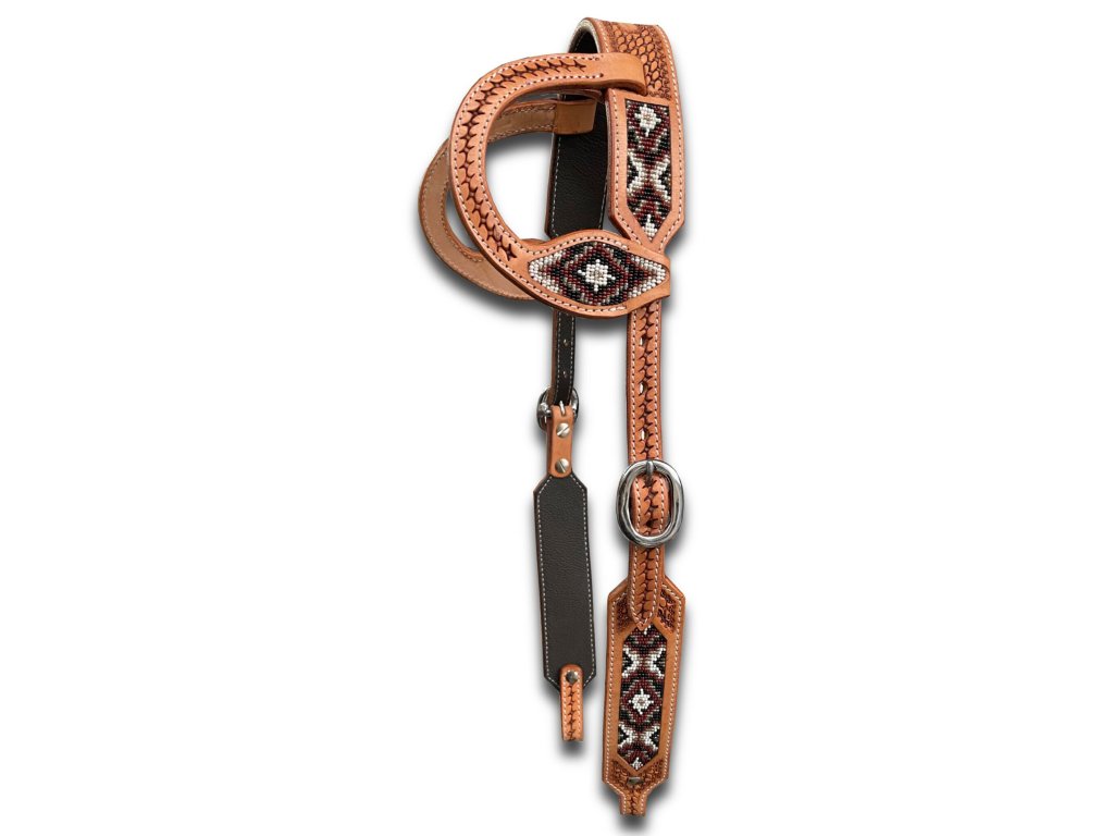Uzdečka s dvojitými uchy. Je vhodná na závody, zdobená našitými korálky v jihozápadním vzoru, s nerezovými přezkami. Je vybavená podšívkou z telecí kůže - zdvojená a velmi kvalitní prošitá kůže. Na objednání v možné i v jiných barevných kombinacích. Velikost QH. Barva: antique russet