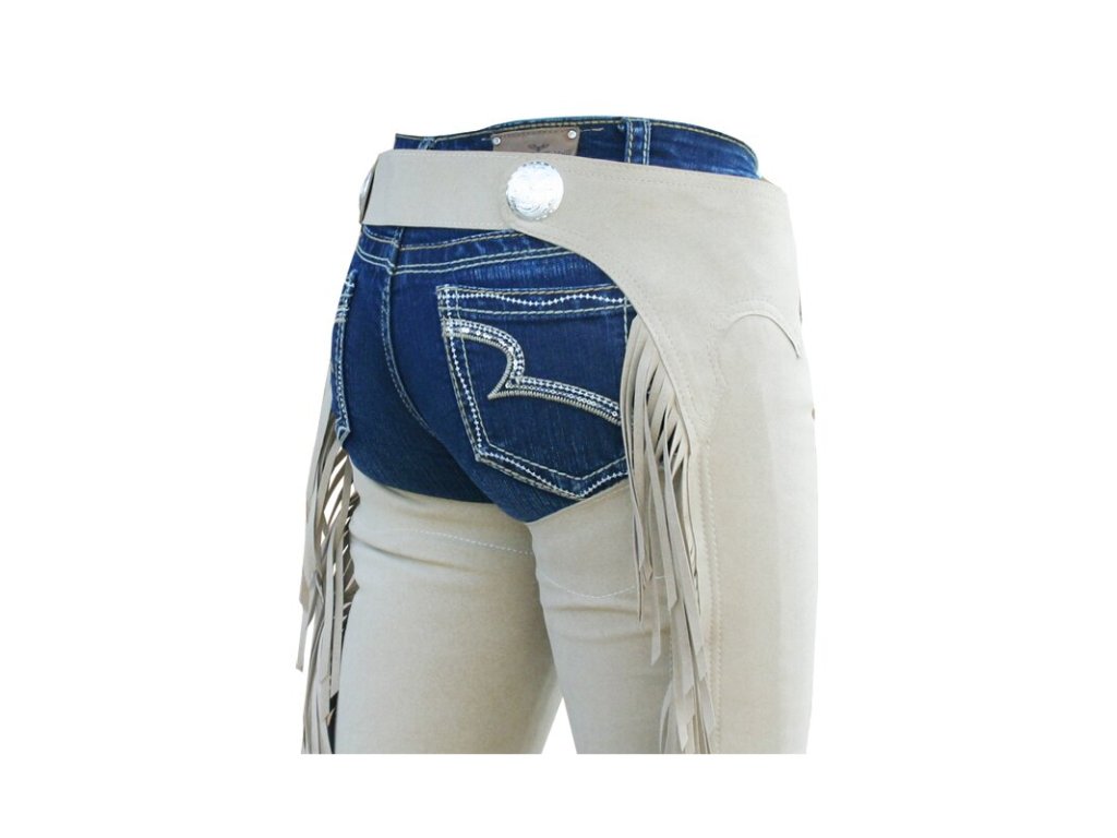 Na zadní straně jsou chapsy vybaveny dvěma ozdobnými stříbrnými conchas, pomocí kterých lze upravit velikost. Přední zapínání tvoří stříbrná přezka, která s conchas ladí. Chapsy mají jemné třásně a jsou vybaveny pevným kovovým zipem.